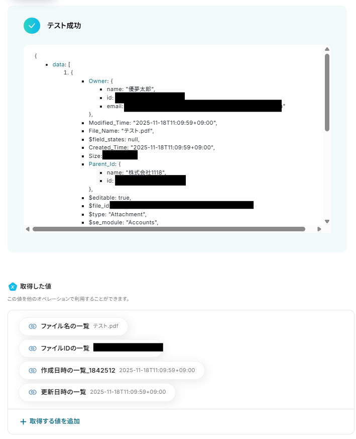 ステップ5:Zoho CRMで取引先の添付ファイル情報を取得