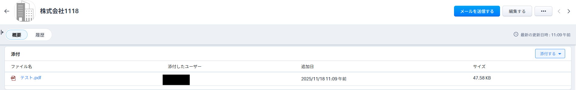 今回のフローで使用したいZoho CRMの取引先にファイルをアップロードしておきましょう。今回は例として、株式会社1118という取引先に「テスト.pdf」というファイルをアップロードしました!