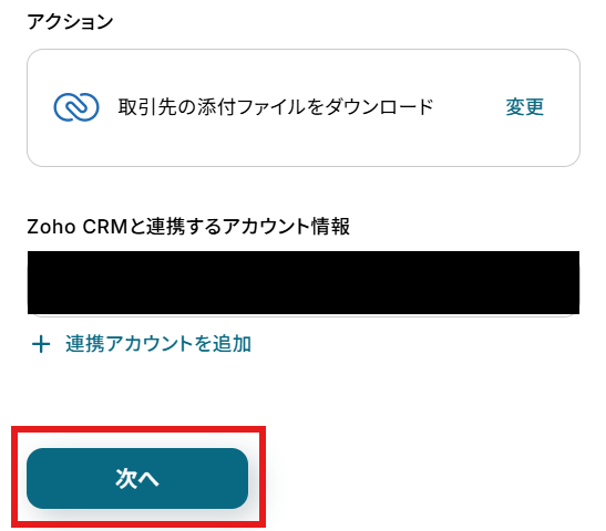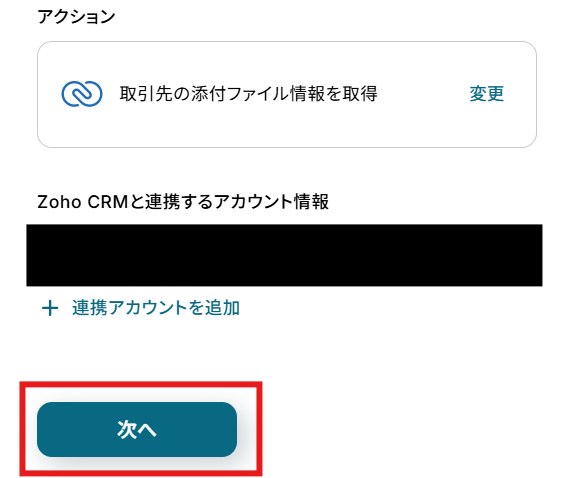 - 次に、Zoho CRMの「取引先の添付ファイル情報を取得」アクションを設定します
