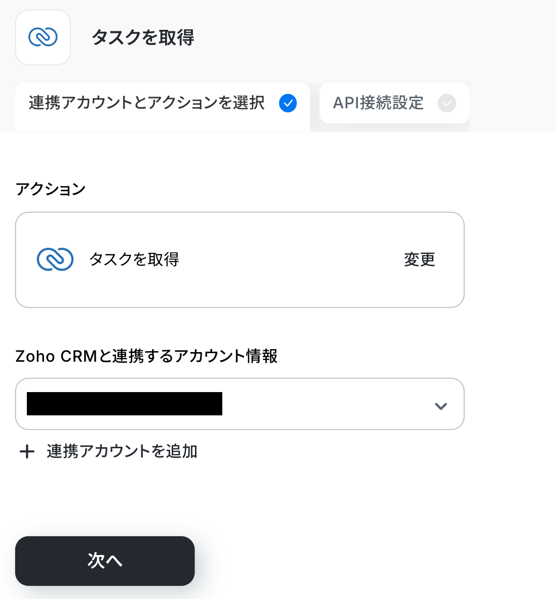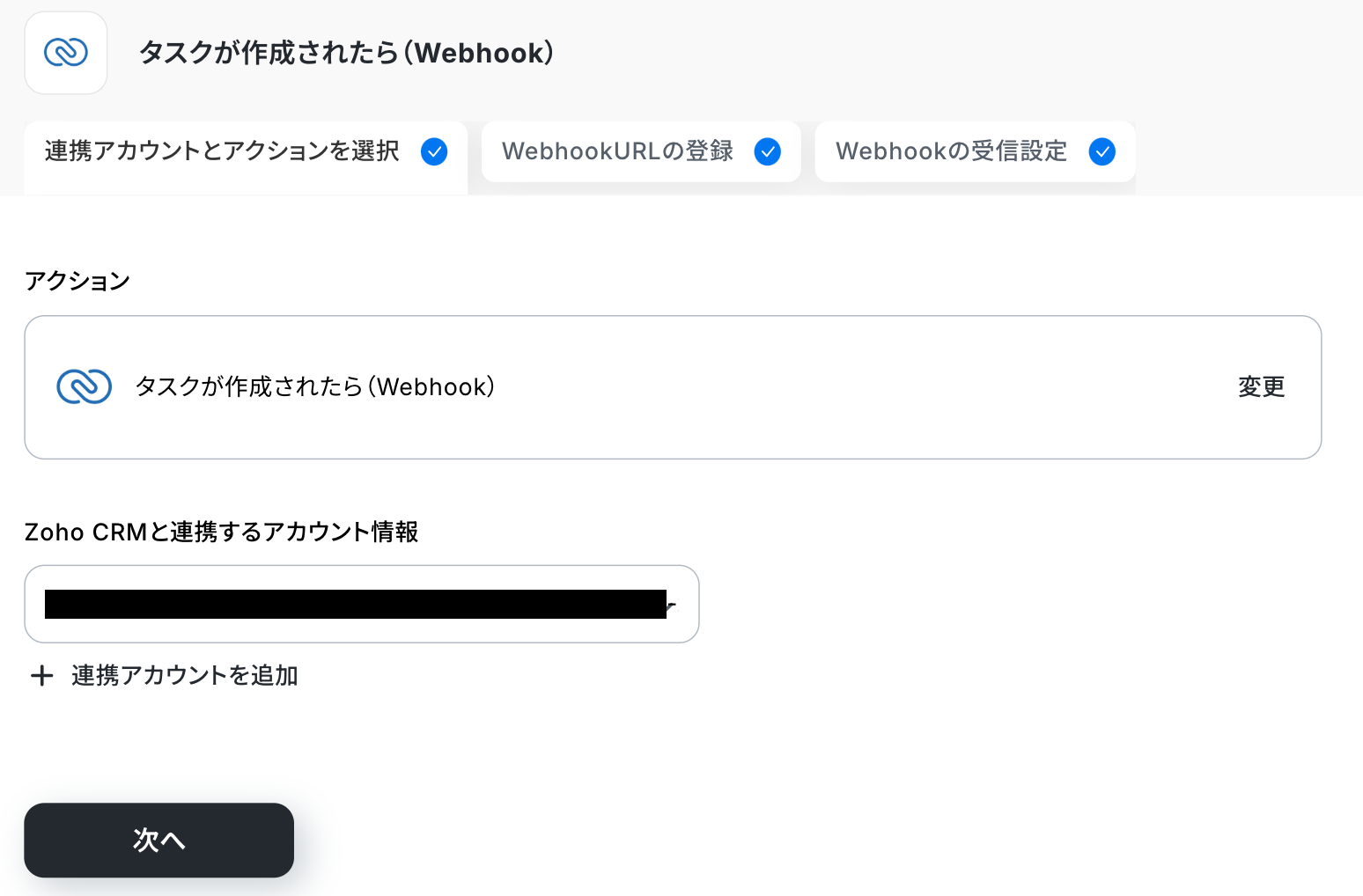 ・Zoho CRMと連携するアカウント情報を確認し、「次へ」をクリックしましょう。