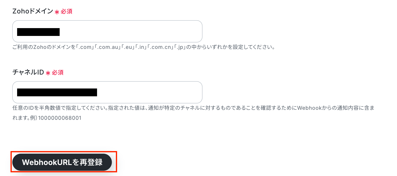 ・ZohoドメインとチャネルIDを入力しましょう。