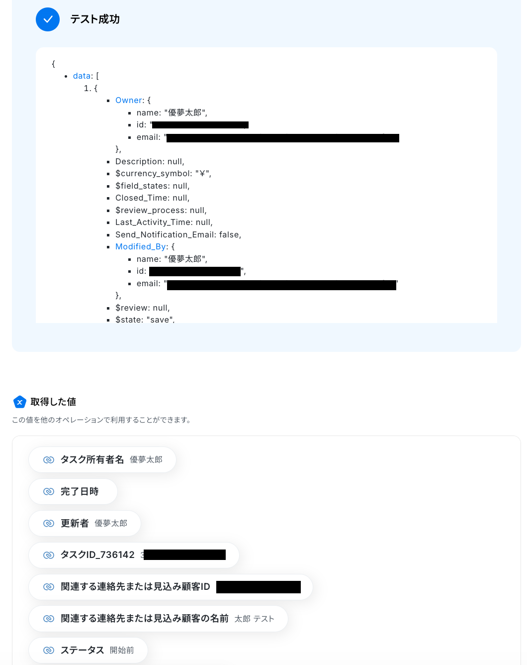 ・Zoho CRMの情報がアウトプットとして取得できたことを確認して、保存しましょう。