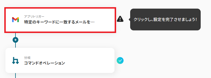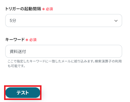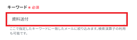 「キーワード」を設定すると、指定したキーワードに一致するメールのみをトリガー対象とすることができます。