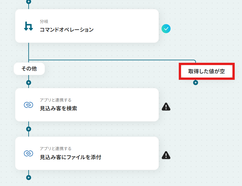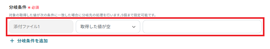 受信したメールに、ファイルが添付されている場合だけ処理を進めるよう、分岐条件を指定していきます。