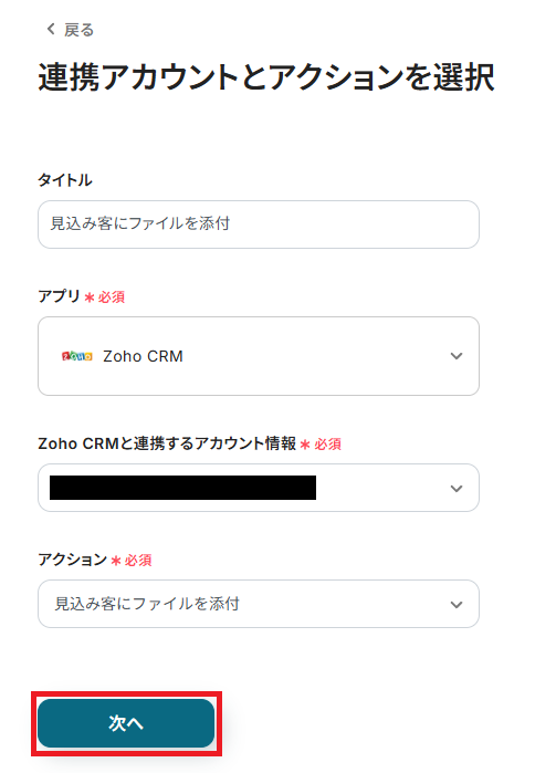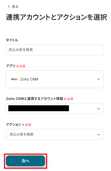 再度、Zoho CRMと連携するアカウントに間違いがないかを確認し、「次へ」をクリックしましょう。