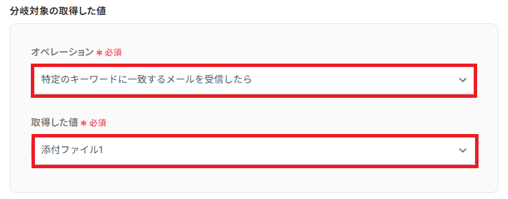 受信したメールに、ファイルが添付されている場合にのみ処理を分岐させるため、下記画像のように設定しました。