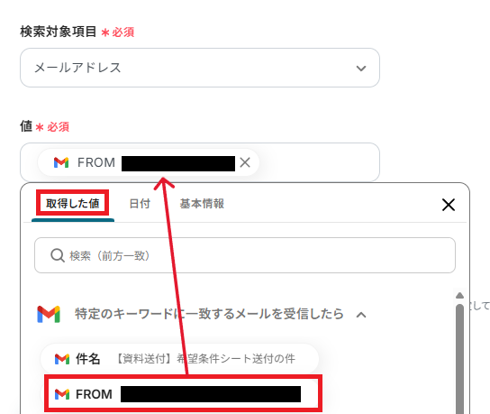「値」には、ステップ3で取得したメールの送信相手を下記の画像のように取得した値から設定しましょう。
