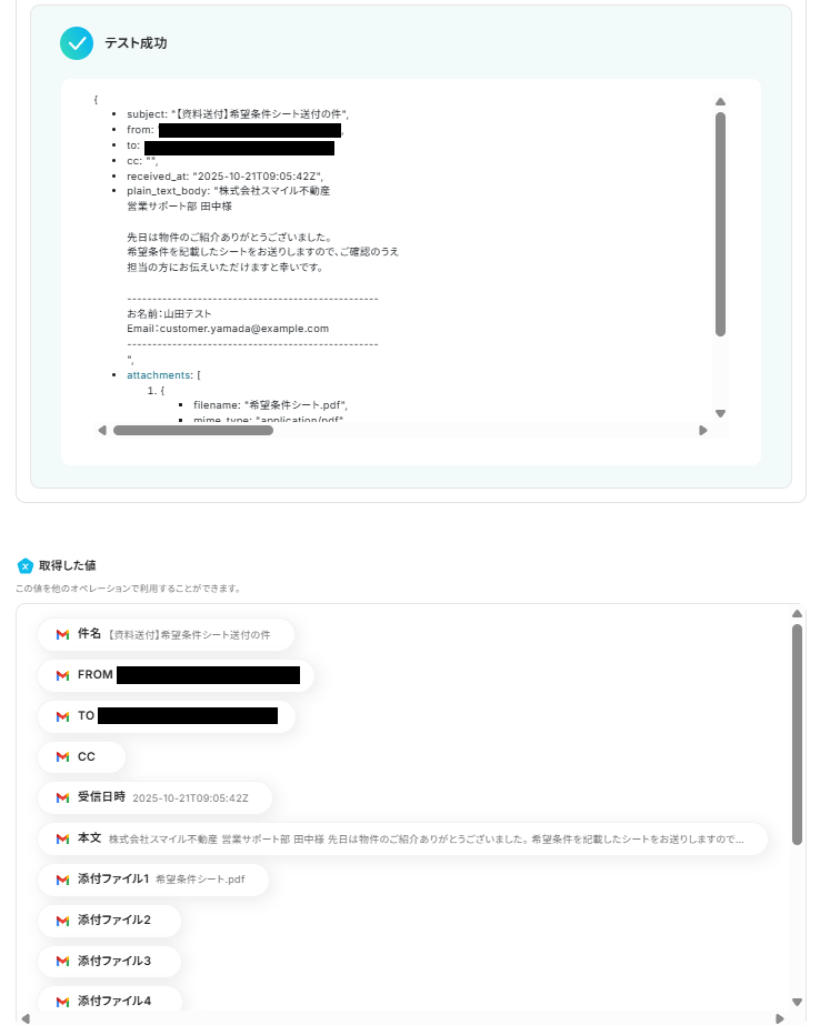 送信が完了したら、Yoomに戻り「テスト」を行います。