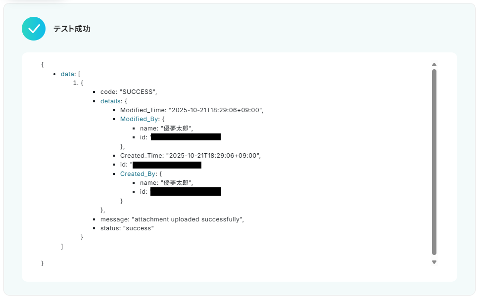テストが成功すると、下記のような取得した値が表示され、Gmailのデータが確認できます。