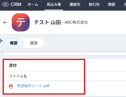 また実際、見込み客情報にファイルが添付されるので、Zoho CRMを確認してみましょう。