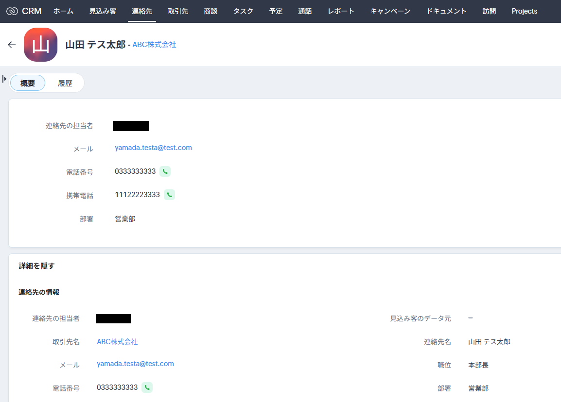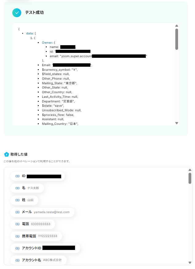 テストに成功すると、連絡先の情報が取得されます。