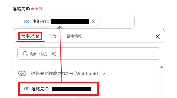 「連絡先ID」は、入力欄をクリックして表示される取得した値から設定してください。