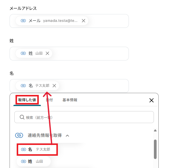前ステップで取得した値を基に、それぞれの項目を設定してください。