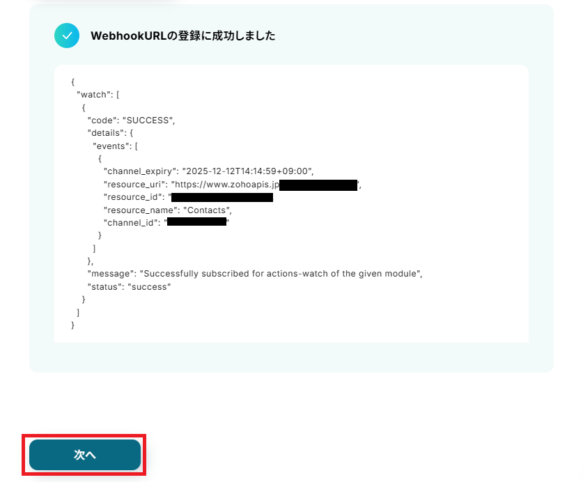 WebhookURLの登録に成功したら「次へ」進みましょう。