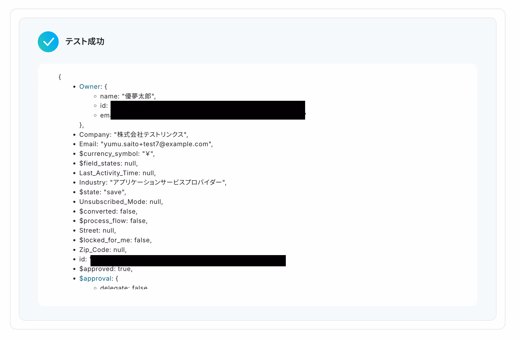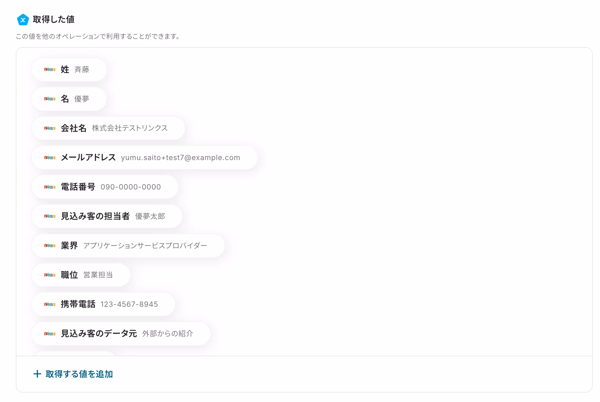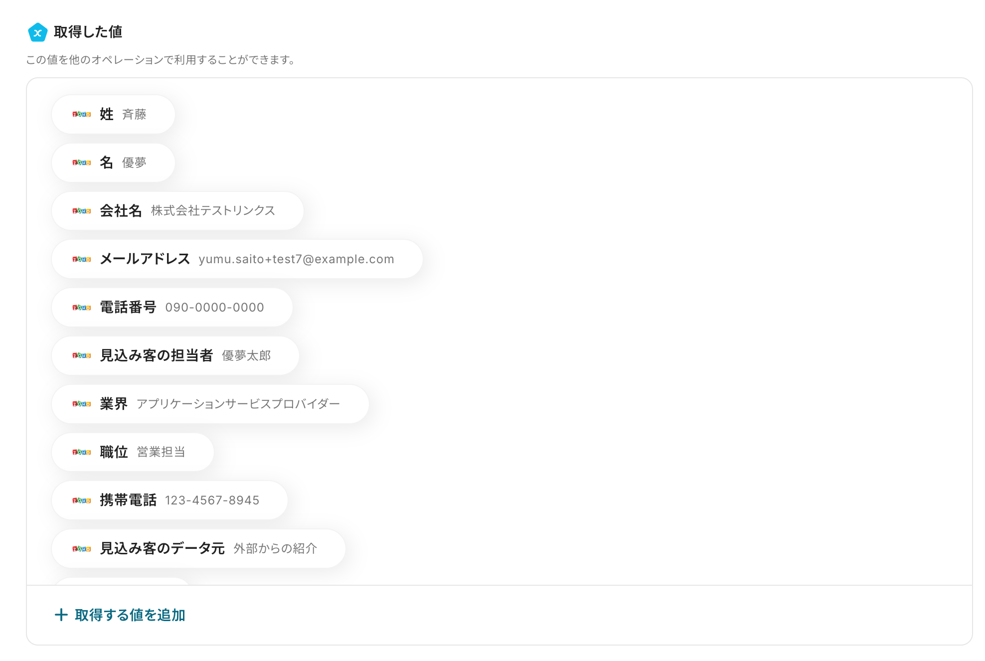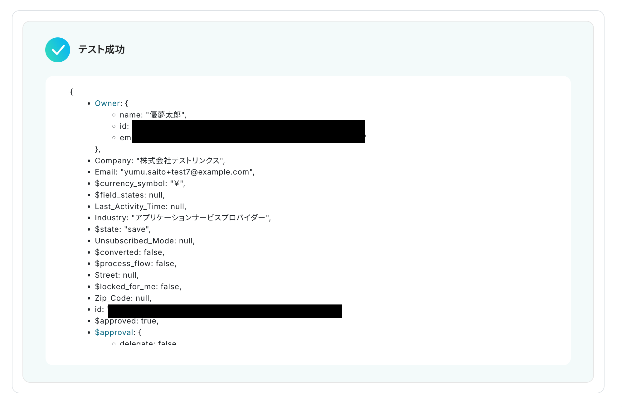 テストが成功すると取得した値が表示され、Zoho CRMのデータが確認できます。「保存する」をクリックして完了です!