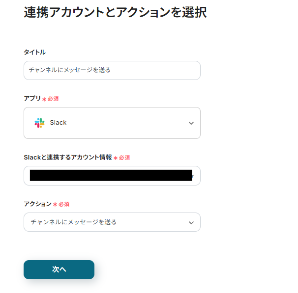 連携アカウントとアクションを選択する画面が表示されるので、今回連携するSlackのアカウントを確認し「次へ」をクリックします。