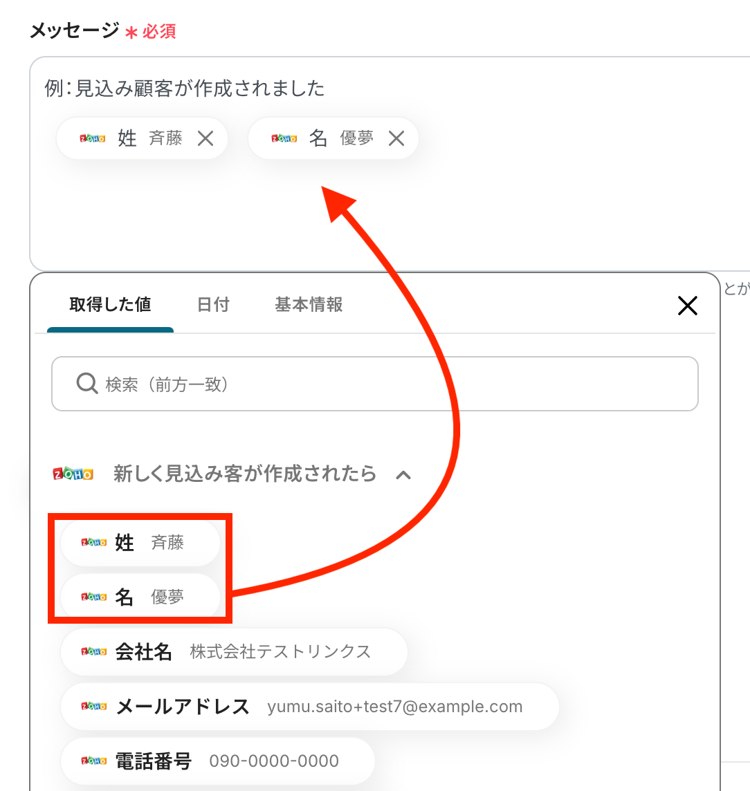 メッセージにはZoho CRMから取得した値を選択し、入力しました。