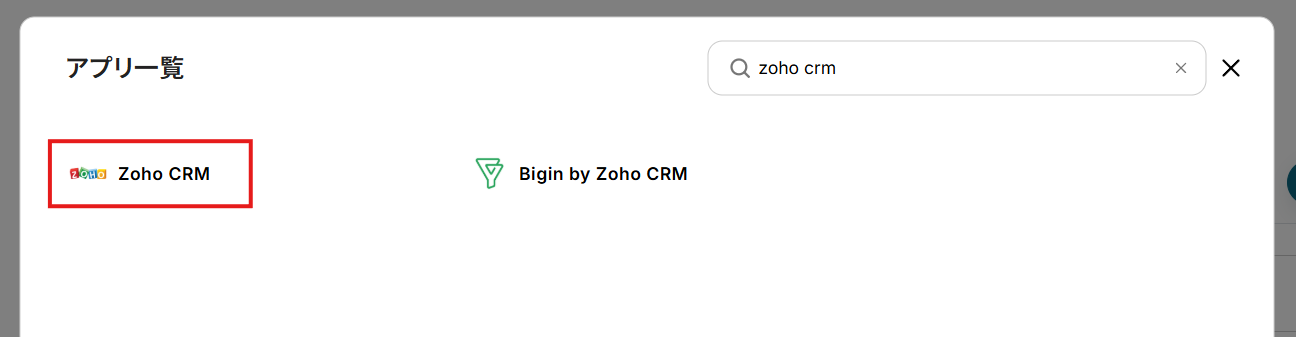新規接続を押したあと、アプリのメニュー一覧が表示されるのでZoho CRMと検索し対象アプリをクリックしてください。