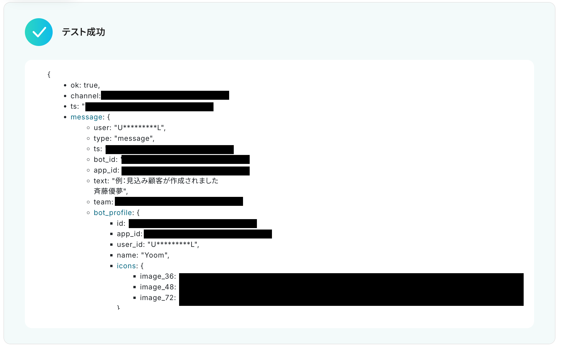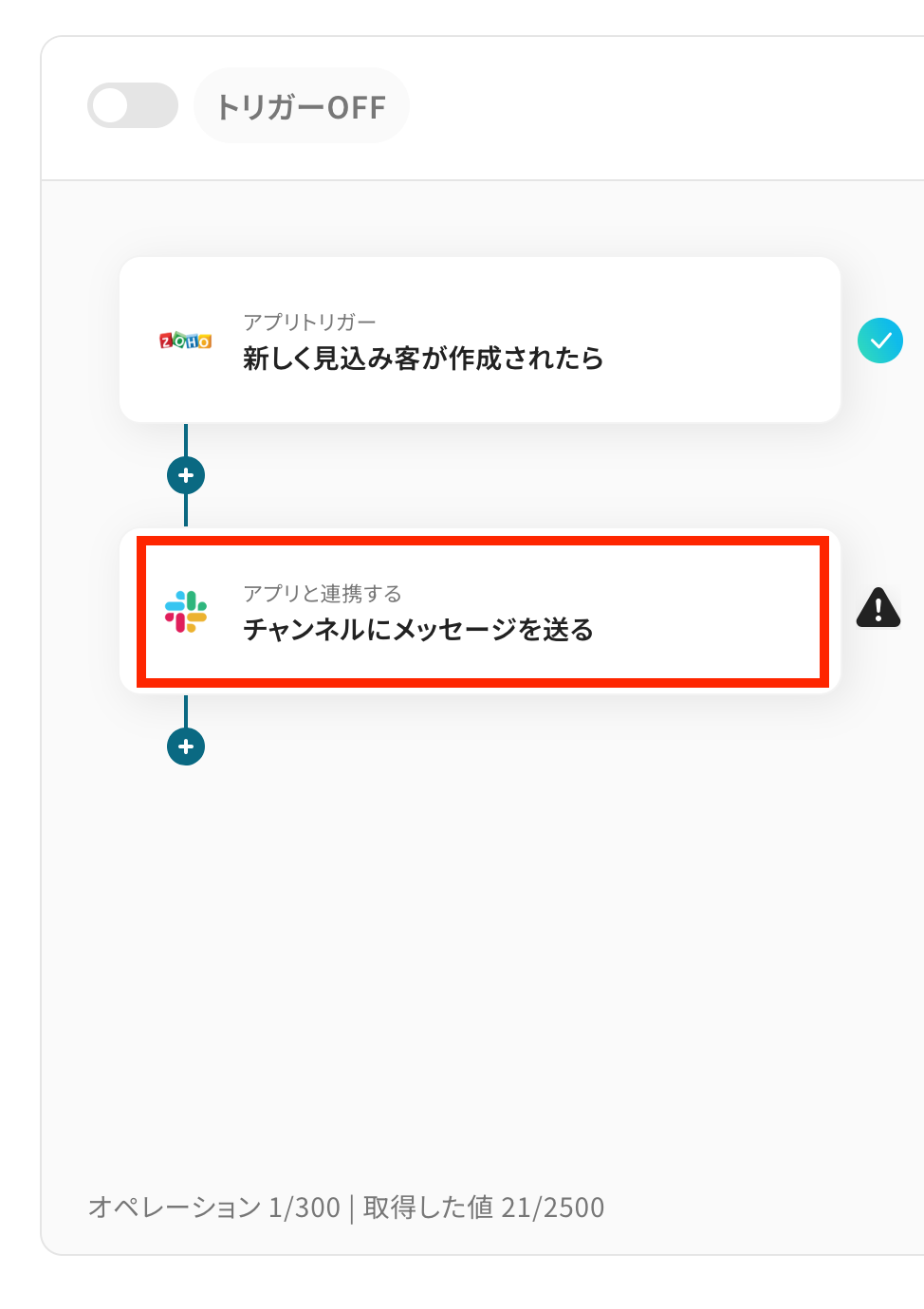 このように取得した値を活用することで最新のデータをその都度Slackへ自動送信可能となります。なお、テキストを直接入力した部分は固定値とされるため、下記画像のように「見込み顧客が作成されました」などは手入力し、毎回変動することが望ましい値は、取得した値を活用しましょう。