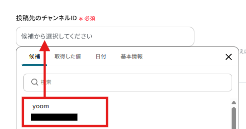 投稿先のチャンネルIDは以下のように表示される候補から選択しましょう。ボックスをクリックすることで候補が表示されます。