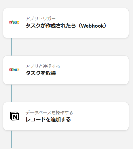 では実際に、プログラミング不要でアプリ連携が可能なYoomで、「Zoho CRMでタスクが登録されたらNotionに追加する」というフローボットの作成方法を紹介します。