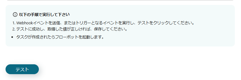次のページでは、記載されている手順に従い、 Webhookイベントを送信またはトリガーとなるイベントを実行し、テストをクリックしてください。