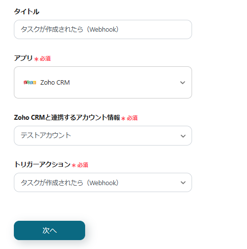 最初のページでは、事前に連携したZoho CRMのアカウント情報が表示されるので確認し、問題なければ、「次へ」をクリックしてください。