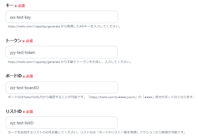 「キー」「トークン」「ボードID」「リストID」は必須項目になっているので、必ず入力してください。