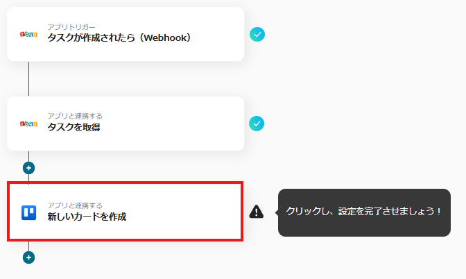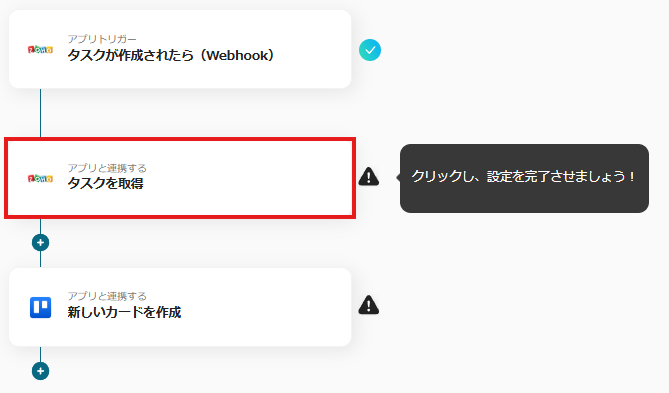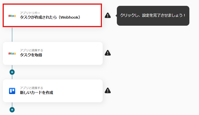 まずは、アプリトリガー「タスクが作成されたら(Webhook)」をクリックしましょう。