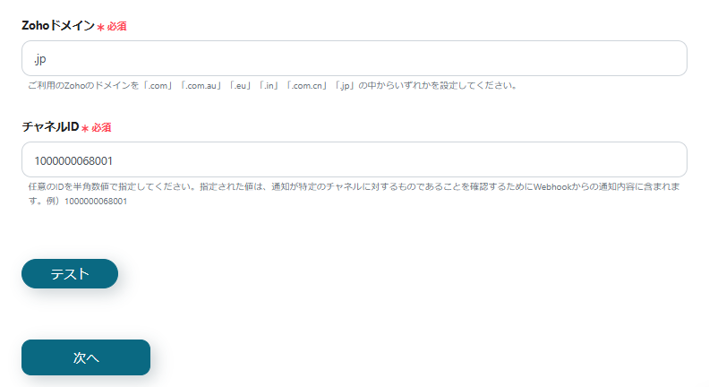 次のページでは、「Zohoドメイン」と「チャネルID」を指定します。
