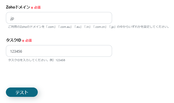 「Zohoドメイン」と「タスクID」を入力して「テスト」をクリックしてください。