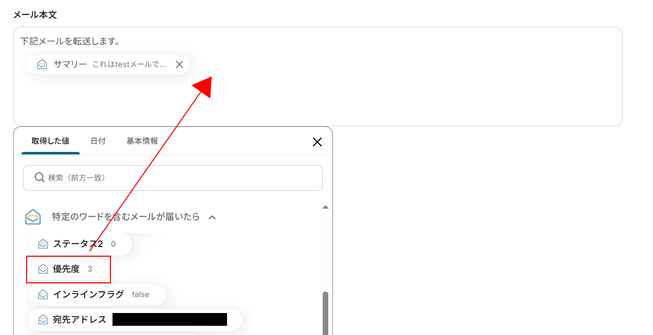 このようにアウトプットを活用することで、最新のデータに基づいてフローが起動し、最新のメールデータをその都度転送可能となります。なお、テキストを直接入力した部分は固定値とされるため、アウトプットを活用せず設定を行うと毎回同じメールデータが転送されてしまうので注意が必要です。
