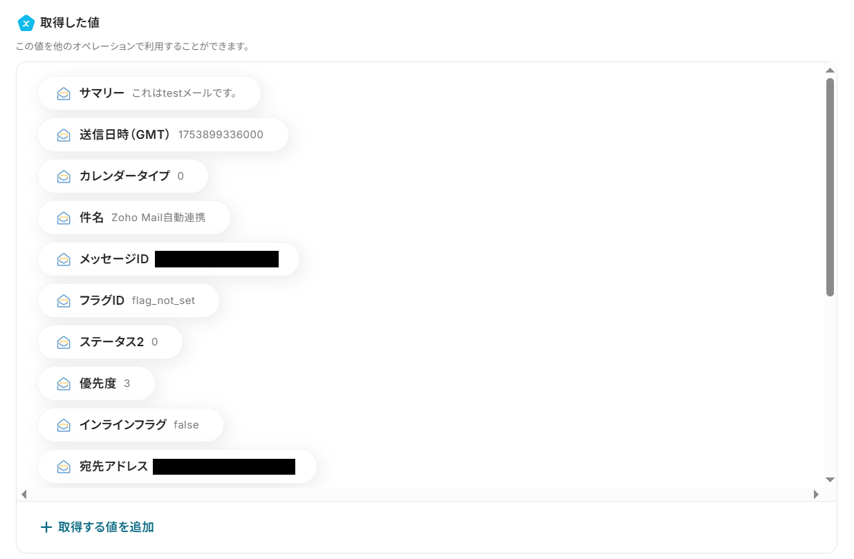 入力欄をクリックすると取得した値を引用することも可能ですので、好きなように追加しましょう。