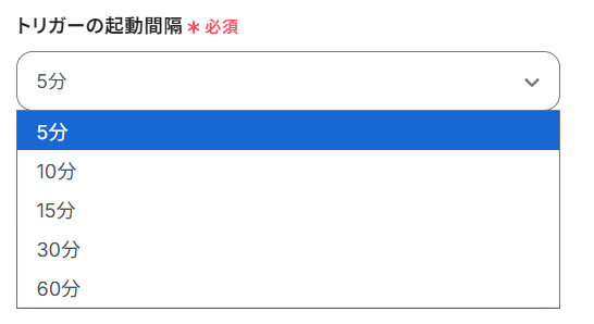- トリガーの起動タイミングは、5分、10分、15分、30分、60分のいずれかで設定できます。