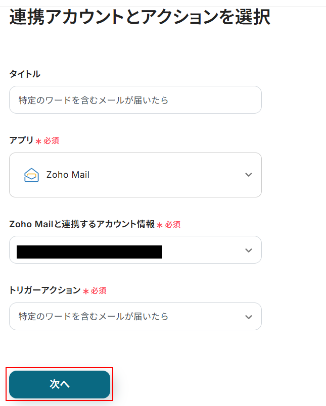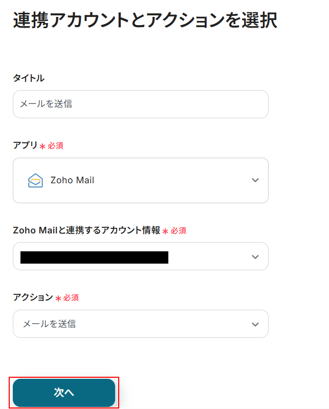 Zoho Mailと連携するアカウント情報に任意のものが設定されていることを確認し、「次へ」をクリックします。