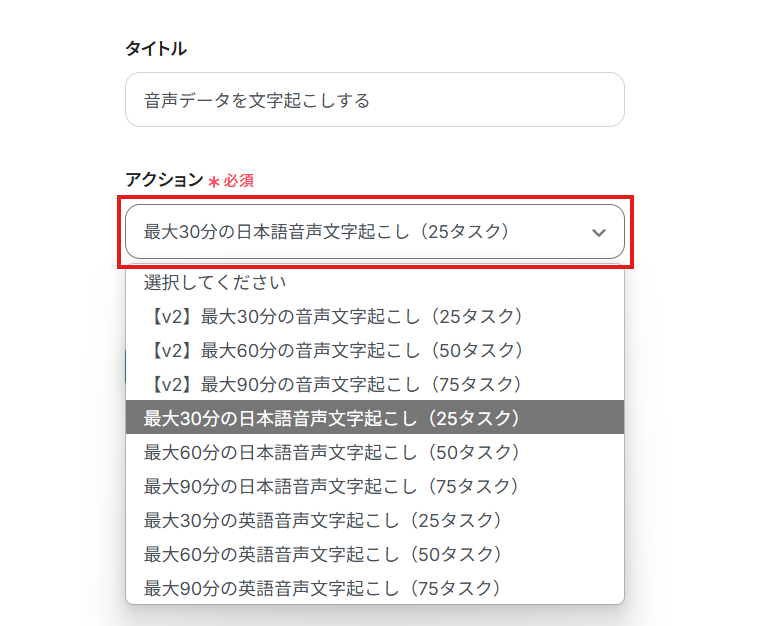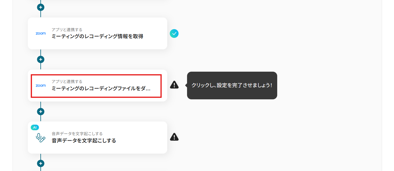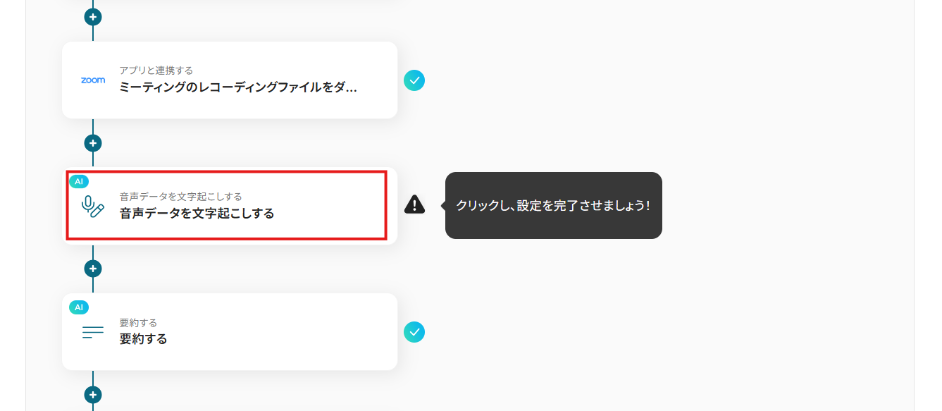 フローの画面に戻り、「音声データを文字起こしする」にチェックマークがついていれば完了です。