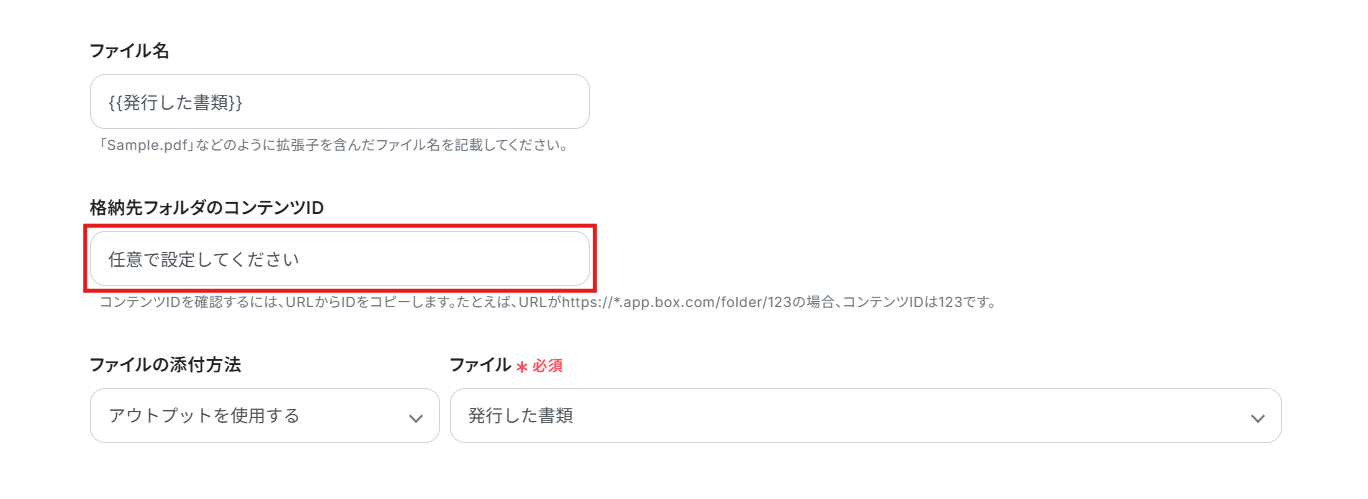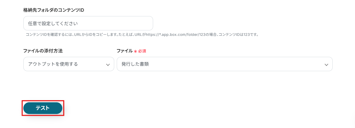 「格納先フォルダのコンテンツID」には、発行したPDFを保存するBoxフォルダのコンテンツIDを設定します。