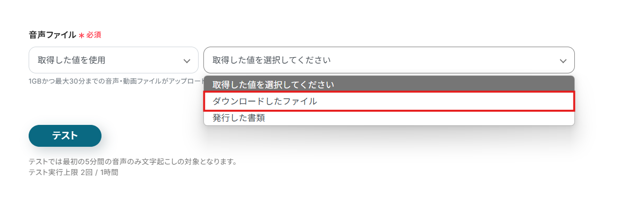 「音声ファイル」のプルダウンから「取得した値を使用」「ダウンロードしたファイル」を選択します。