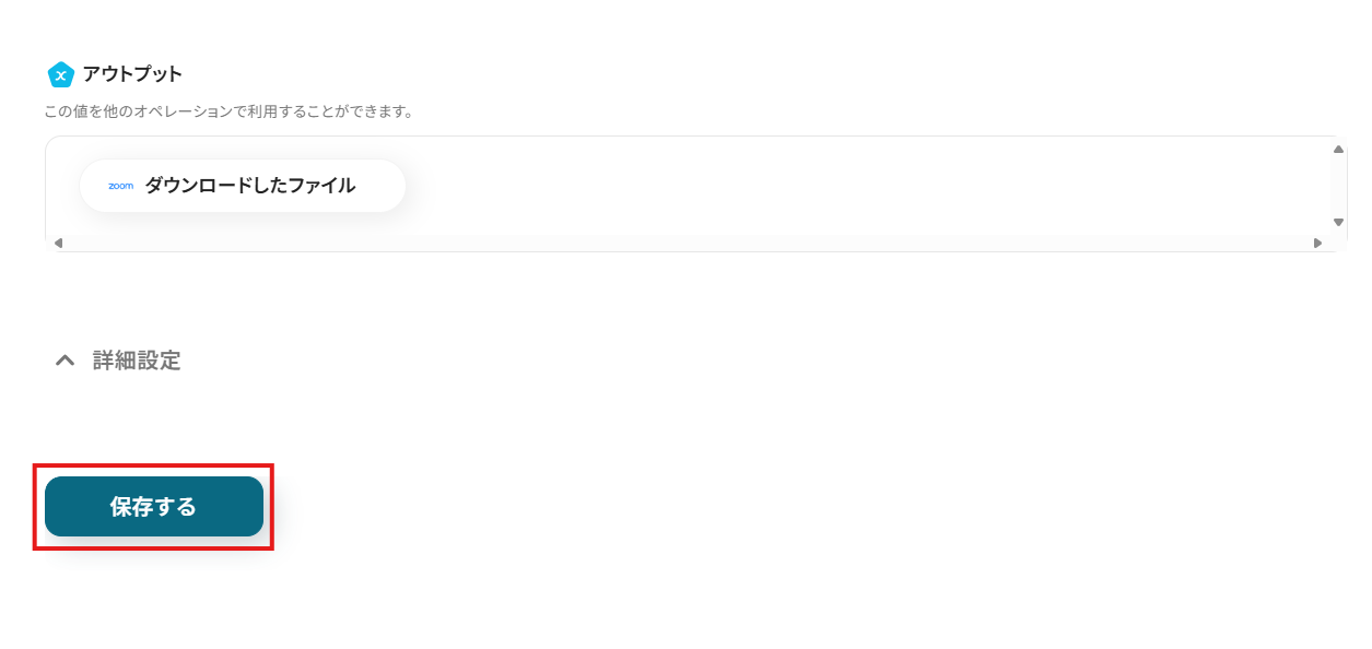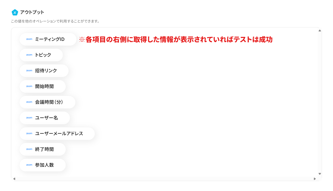 「テスト成功」の結果が表示されると、「アウトプット」にミーティング情報が追加されますので、アウトプットに問題がなければ「保存する」をクリックしてください。