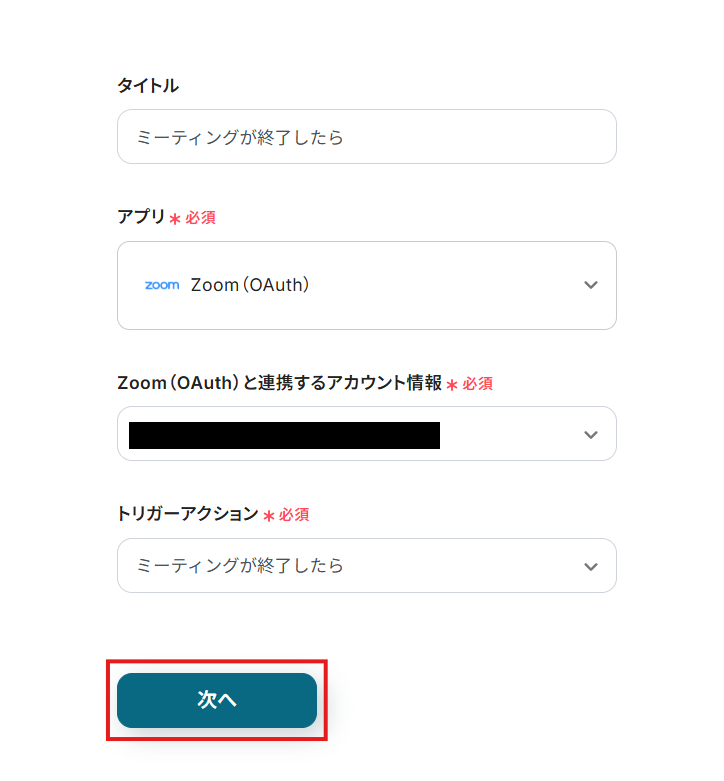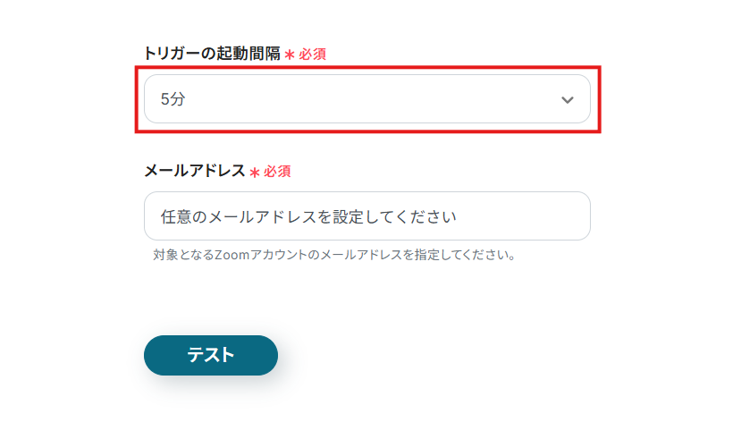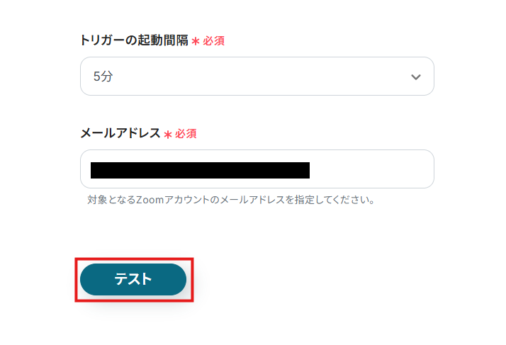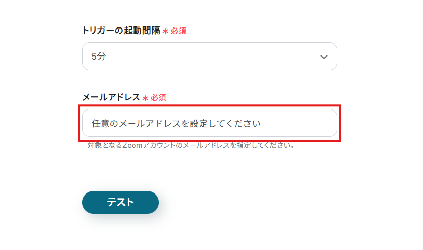 「メールアドレス」には、トリガーとして設定したいZoomアカウントのメールアドレスを入力します。