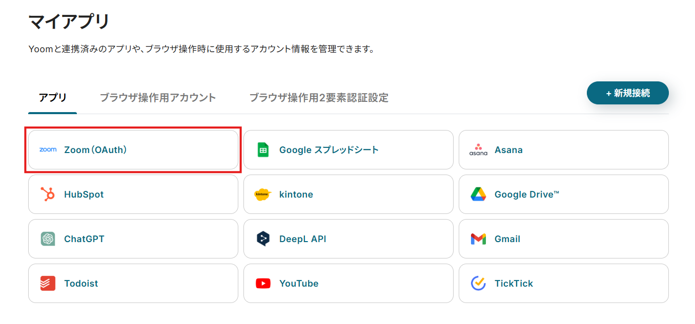 Yoom管理画面のサイドバーから「マイアプリ」を選択し、マイアプリ画面の右側にある「+新規接続」をクリックします。