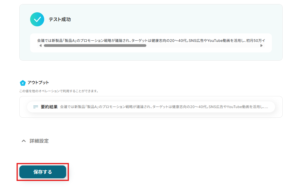テストが成功すると、要約された文章が確認できるので「保存する」でここまでの設定は完了です!