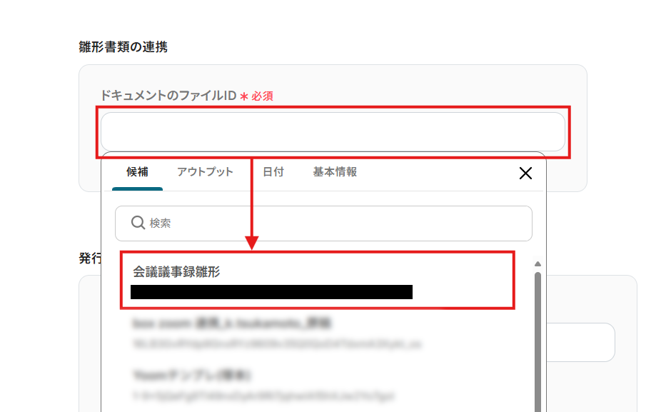 入力欄をクリックすると、連携しているGoogleアカウントから候補が表示されますので、対象となる雛形ドキュメントを選択します。