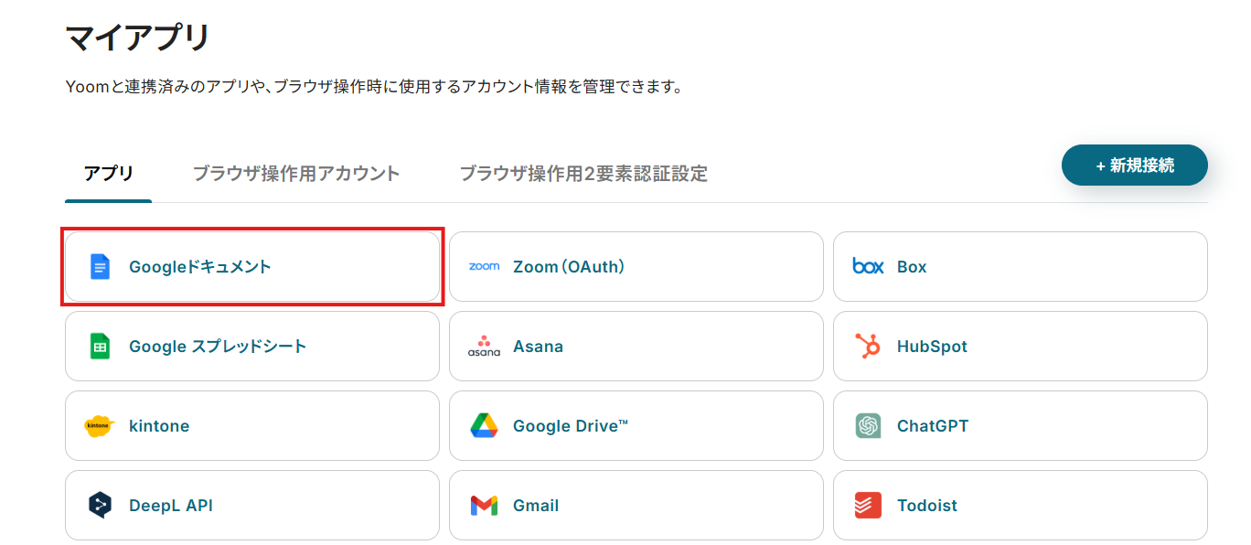 今回のフローで使用する3つのアプリ(Zoom、Box、Googleドキュメント)をマイアプリに登録し、Yoomと連携させます。