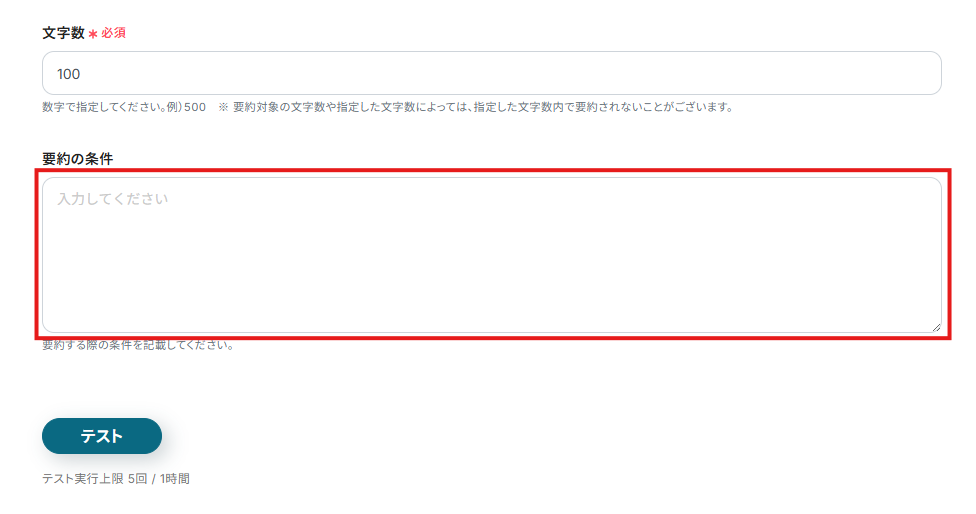 「文字数」には、何文字ほどの要約を行うかを任意で設定します。
