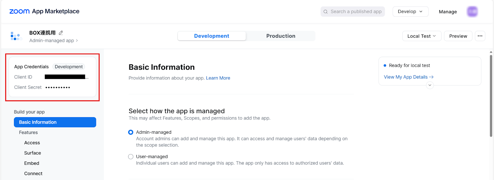 ※ Zoom上の「Client ID」と「Client Secret」の確認箇所。クリックでコピーが可能。
