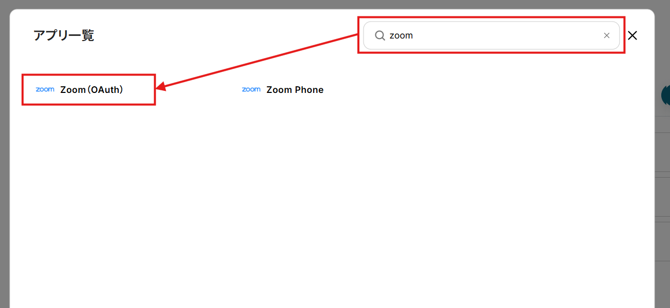 「アプリ一覧」が表示されたら、Zoomを検索して選択します。