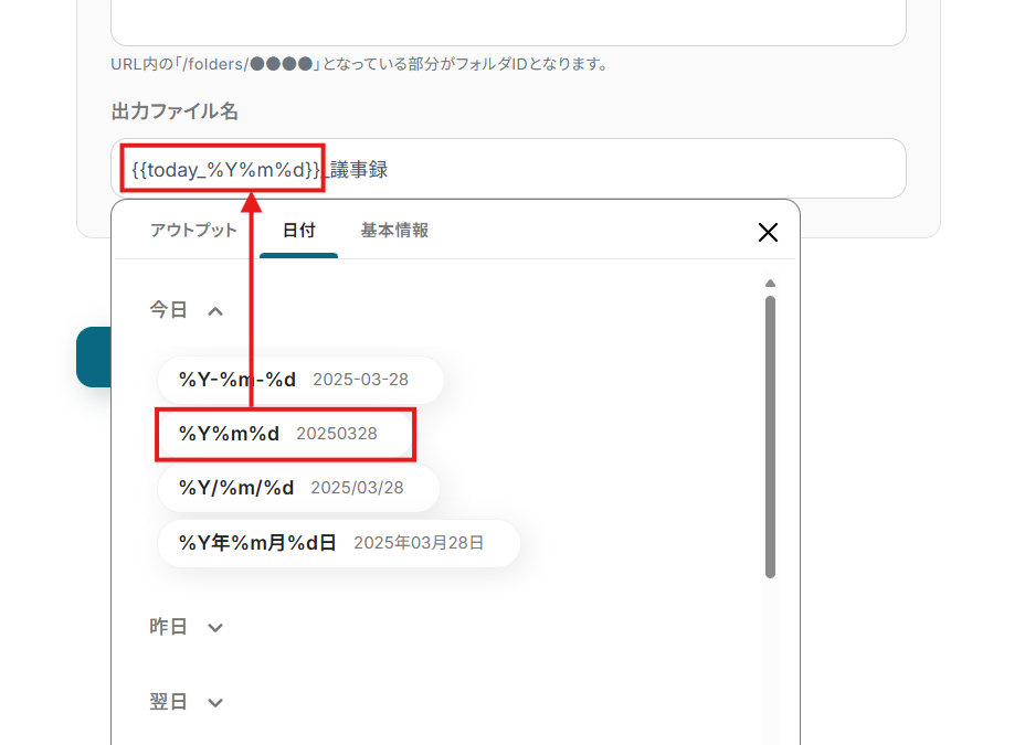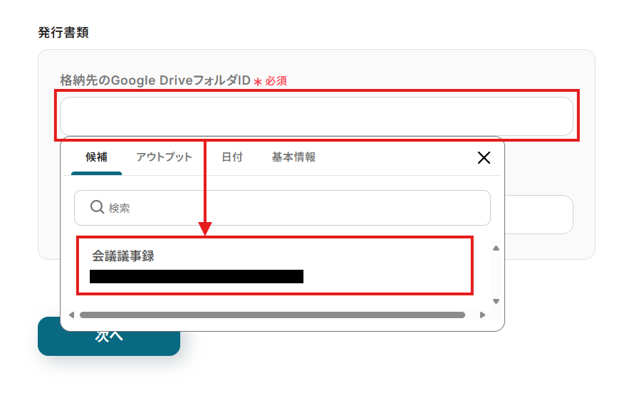 同じく入力欄をクリックすると、連携しているGoogleアカウントから候補が表示されますので、対象となるフォルダを選択します。