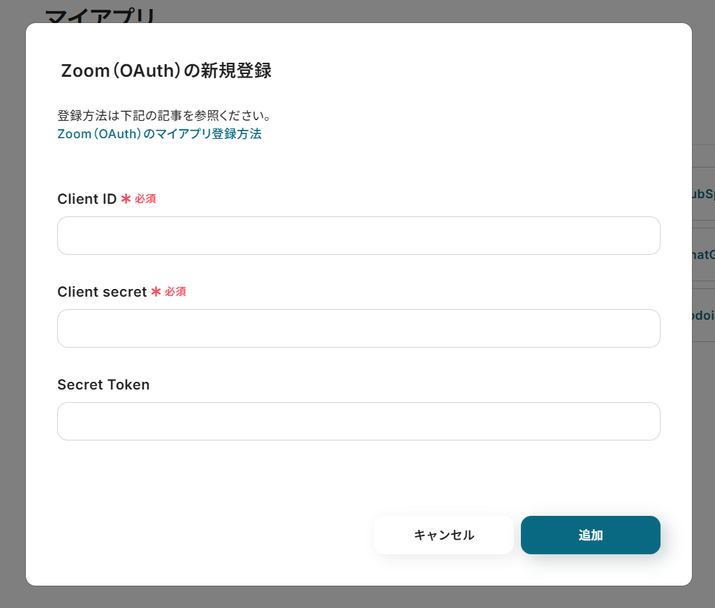 こちらの記事を参照してYoomとZoomの連携を設定し、「Client ID」「Client Secret」「Secret Token」をそれぞれ入力します。