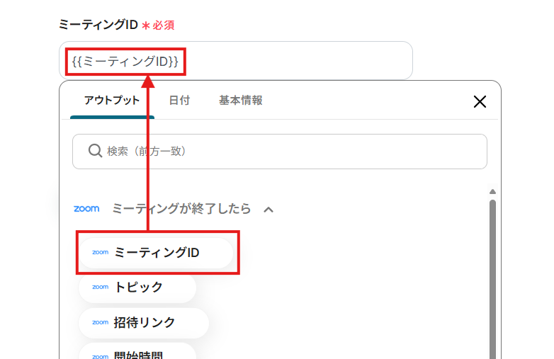 「ミーティングID」には、ステップ3で取得したミーティングIDが設定されています。